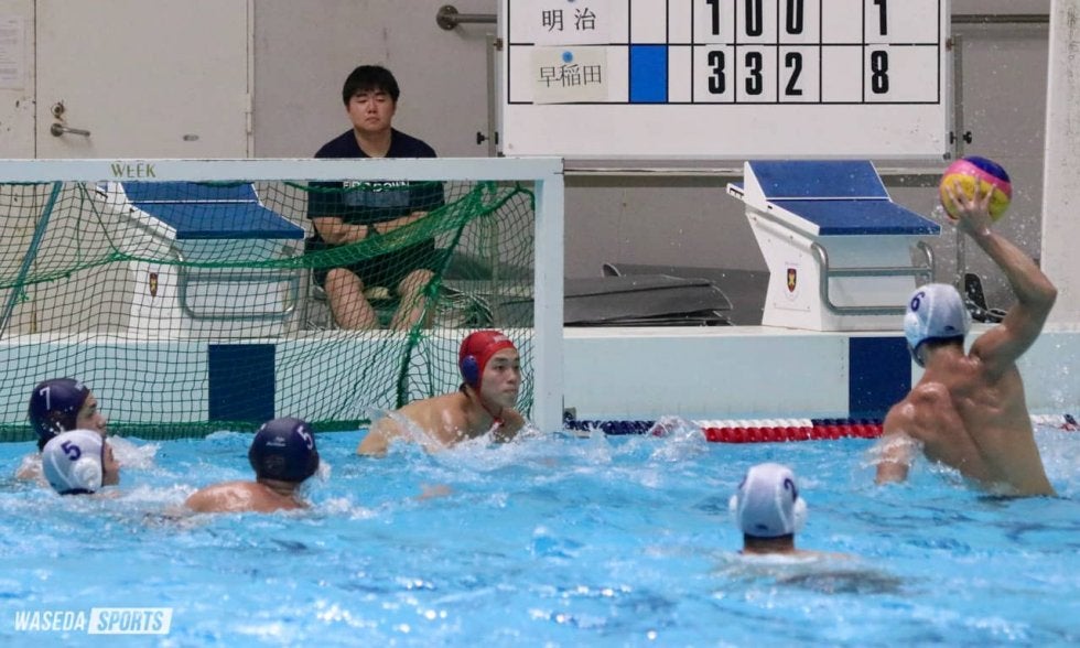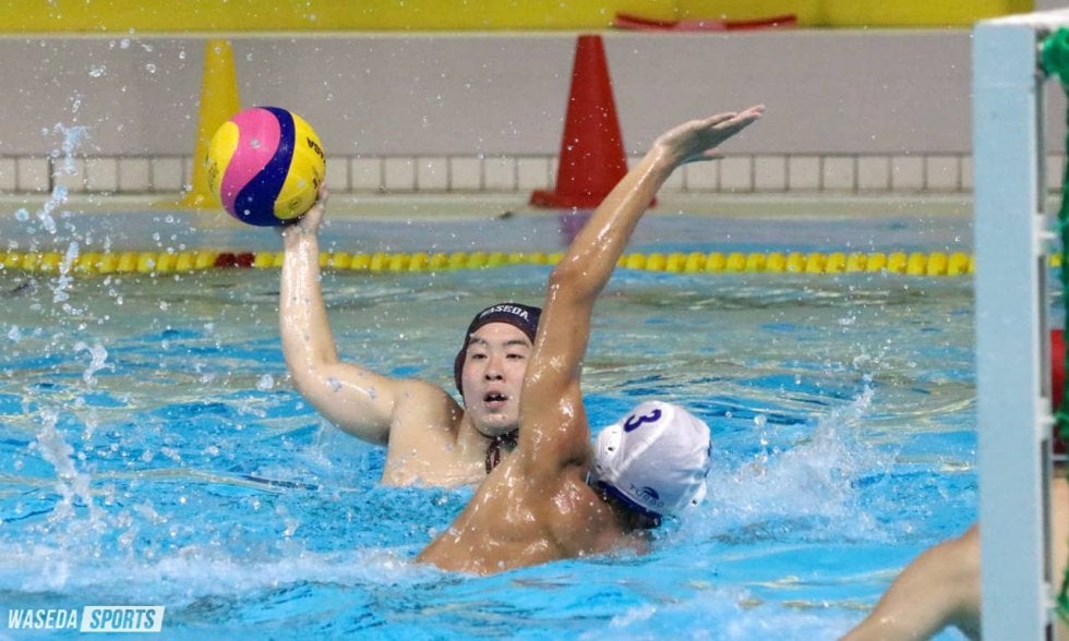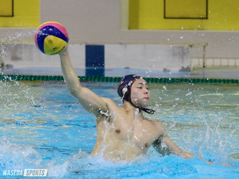 勢いを離したくない後半第3P。再開のブザーが鳴りすぐさまオフェンス態勢に入ると、30秒で右サイドにいた曳地にチャンスが。何度もフェイントをかけた末にゴールを割った。続いて2分半、カウンターから中村がボールを得ると、ゴール前まで自ら独走。30秒計を確認して、ゆっくりとネットを揺らした。その後1点を失い、早大が退水(※)を取られたところでタイムアウト。明けた直後に中村が得点し、陣形を整えた。6分には、左サイドにいた都田が明大GKと1対1に。見事にバウンドシュートを決め入れ、10-3と上々の出来で最終Pに入った。第4P2分、またも中村が単独でゴール前へ。GKと近距離になったためループシュートを選択し、余裕たっぷりにポイントを取った。直後の失点からは、加藤旺道(スポ1=静岡・磐田)がボールを処理。そこで「くれ!」と叫んだのはまたもポイントゲッター・中村。飛び跳ねるようなモーションから左下に突き刺した。しかし、「最後に流れが悪くなってしまった(永野)」と振り返るように、ここから3連続で得点を奪われる。早大が2度目のタイムアウトを取ると、落ち着いたパス回しから都田がしっかりと決めて立て直した。6分には中村がダメ押しのゴール。ラスト30秒の明大側の攻撃の流れもしっかり抑えて、14-9で試合は終了。終盤に詰め寄られるも、上位リーグ進出に向け大きな一勝を収めた。