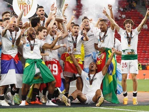 ローマを倒してヨーロッパリーグ優勝を果たし、歓喜するセビージャの選手たち