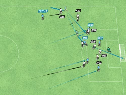 川崎は、登里が左サイドでボールを持ち込んだあと、どのようにして相手を崩したか