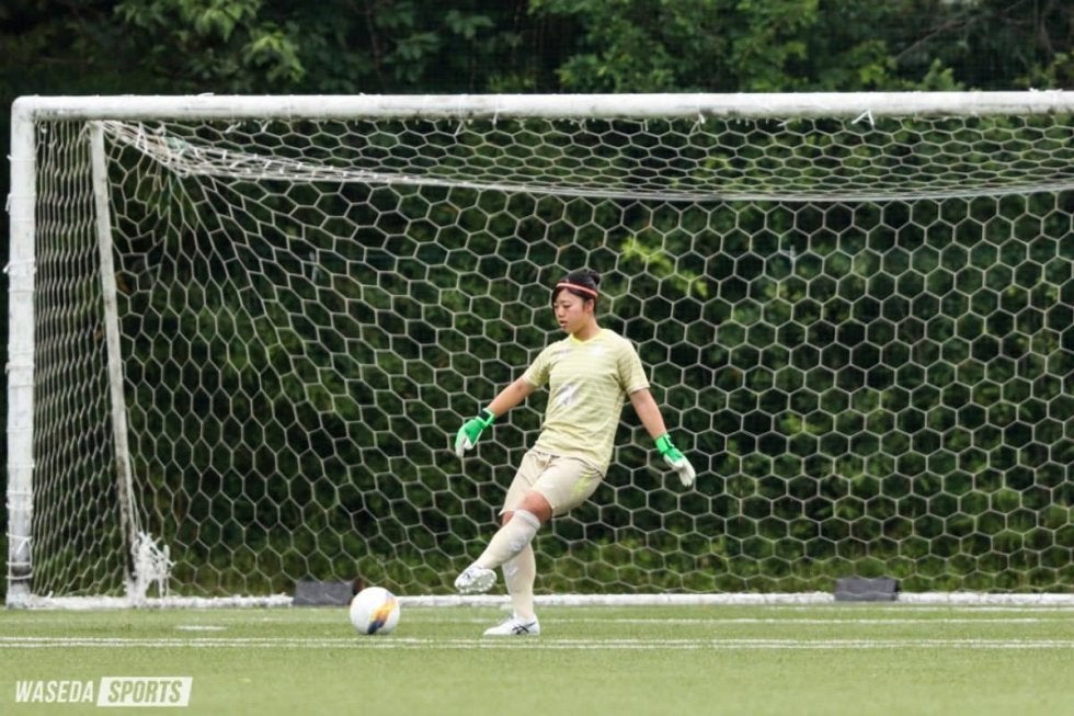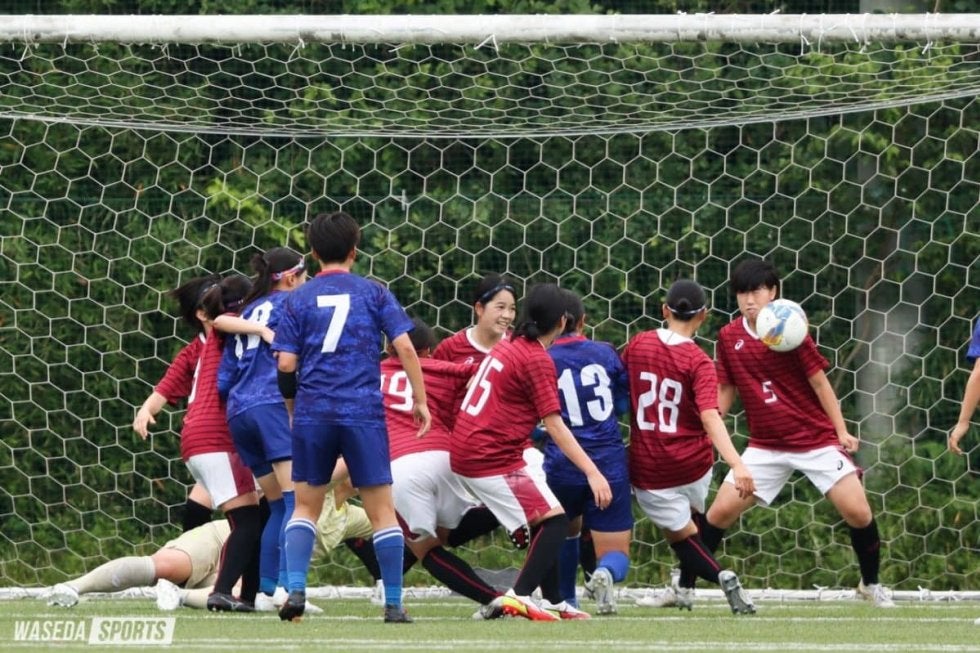 台風一過の好天に恵まれた東伏見。湿度も高く強い日差しが降り注ぐ中、関東リーグ前期のラストゲームは幕を開けた。試合開始直後1分、DF田頭花菜(スポ3=東京・十文字)のロングボールを収めたFW﨑岡由真(スポ1=埼玉・浦和レッズレディースユース)がシュートを放ったが枠外に飛ぶ。幸先の良いスタートを切ったかと思われたが、ここからゲームは次第に相手ペースに。14分には相手CKからピンチを迎えるが、田頭や田村を中心に自ゴール前で粘り強く対応し、最後はDF木南花菜(スポ3=ちふれASエルフェン埼玉マリ)がクリア。失点を許さない。防戦一方の展開が続いたのを見かねたか、37分にFW千葉梨々花(スポ1=東京・十文字)を投入。前線での起点づくりという意味での応急処置的な交代になった。41分には右サイドに張ったMF新井みゆき(スポ1=埼玉・浦和レッズレディースユース)がMF淀川知華(商2=山梨・日本航空)のパスを受け、運んでからクロスを上げる。しかしこれはキーパー正面。その後も有効な攻撃を生み出せず、前半を折り返した。