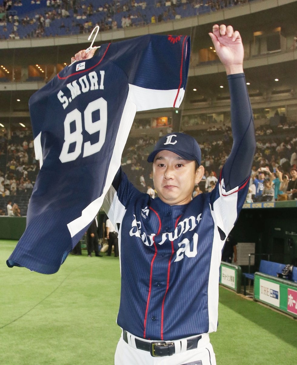 日本ハム―西武 亡くなった森慎二氏のユニホームを手に、ファンの声援に応える西武・野上=東京ドーム【写真提供:共同通信社】
