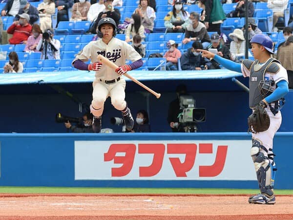 明治大・飯森太慈が打席に入る際のルーティンとしている垂直ジャンプ