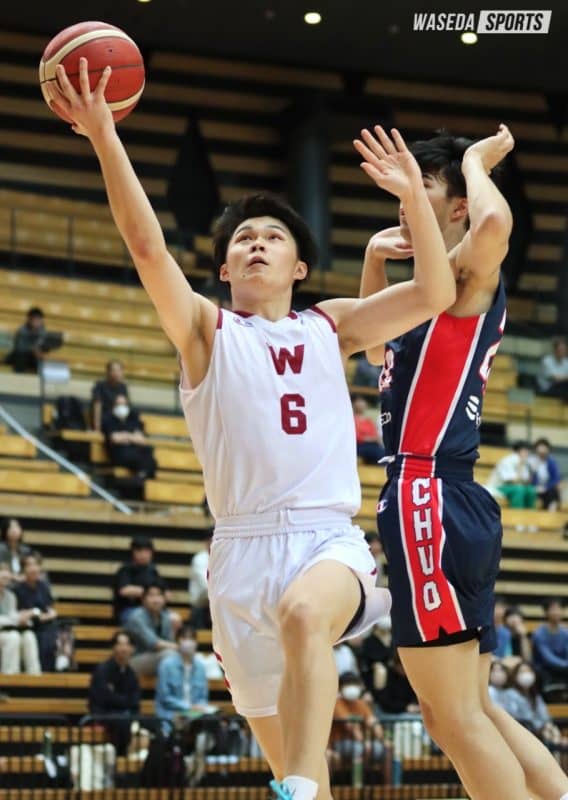 試合開始直後、中央大にスリーポイント2本を含む10得点を挙げられ、早くも早大がタイムアウトを要求。タイムアウト後にG岩屋頼(スポ2=京都・洛南)が得点して持ち直すも、中央大のペースで試合が進む。第1Q終盤で堀田が連続スリーポイントを決め、なんとか点差を1桁に縮めて第2Qへ。G下山瑛司(スポ1=愛知・中部第一)、F三浦健一(スポ1=京都・洛南)、G城戸賢心(スポ1=福岡第一)の1年生ルーキーを中心に得点し、徐々に差を詰める。さらに堀田が2本のスリーポイントを決めるも、逆転は叶わず42-46で前半を終えた。