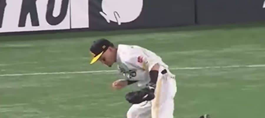 ソフトバンクの牧原大が連日の好守、ほぼ外野の守備位置で捕球してアウトに