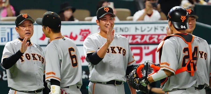 今季初勝利を挙げた巨人・菅野智之(中央)【写真:荒川祐史】