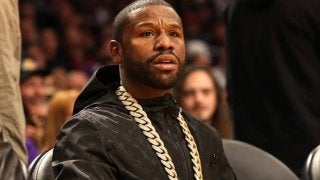 以前から交流があったというマフィアの孫と対峙したメイウェザー。しかし、試合はカオスな形で幕切れとなった(C)Getty …