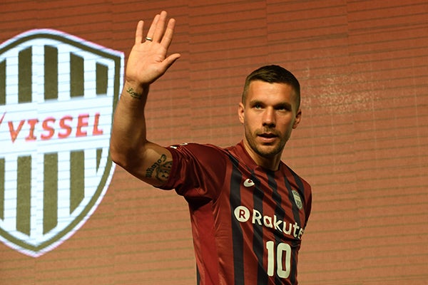 6日の入団会見を受けるポドルスキ(写真:Getty Images)「(日本語で)こんにちは。ポドルスキです」minus;…