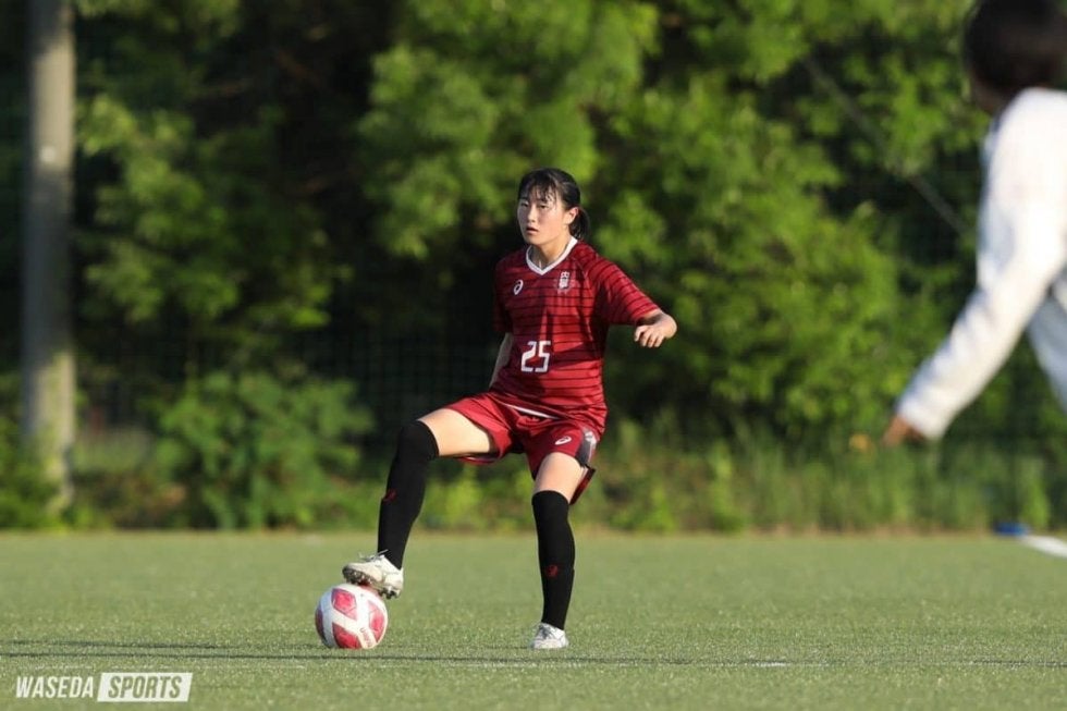 冷静なプレーをみせたDF杉山遥菜(スポ1=東京・十文字)。裏に走る三谷へのロングボールも通した