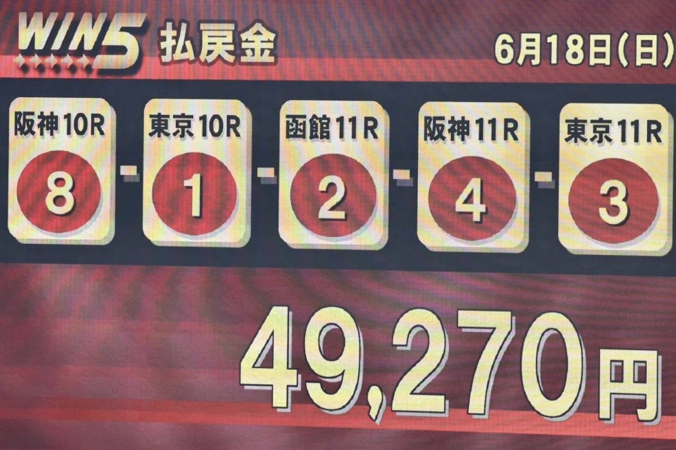 6月18日に行われたWIN5は9067票的中、4万9270円の払戻しとなった。東京競馬場で行われたユニコーンステークス(G3・ダ1600m)では1番人気でC.ルメール騎乗騎乗、ペリエールが勝利し、阪神競馬場で行われたマーメイドステークス(G3・芝2000m)でも1番人気で西村淳也騎乗、ビッグリボンが勝利。堅い決着が続き、的中も9000票を超えた。