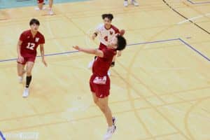 続く第2セットはセッター前田凌吾のサービスエースで幕を開けると、相手のミスもあり、4連続得点を決める。その後も、水町や山田の2連続サービスエース、 MB麻野堅斗(スポ1=京都・東山)のクイックなどでブレイクを重ねる。途中出場の安食浩士(スポ1=宮城・東北)が相手のブロックしたボールが観客席まで飛ぶほどの強烈なスパイクを決めるなど、攻撃に徹し、25-17で第2セットもものにした。