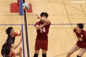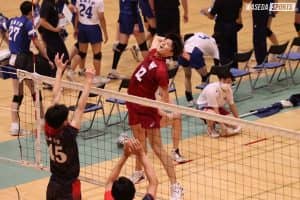 第1セットは幕開けから3連続得点を許し、一時は3―8まで離される。しかし、ブロックでワンタッチを取りながらリベロ布台駿(社4=東京・早実)を中心にフォローし、OH山田大貴(スポ4=静岡・清水桜が丘)らが決める形でブレイクを重ねた。MB伊藤吏玖副将(スポ4=東京・駿台学園)がクイックを決めたのを皮切りに、OP畑虎太郎(スポ2=福井工大福井)が目を覚まし、サービスエースで15-13。終盤もその勢いは止まらない。バックからのプッシュが決まらず、もう一度セッター前田凌吾(スポ2=大阪・清風)が畑を選択。強打を打ち込むと思いきや、OH水町泰杜主将(スポ4=熊本・鎮西)へフェイクセット。水町もうまく合わせて決めきると、意外過ぎるプレーに大いに盛り上がった。興奮冷めやらぬ中、前田のここぞとばかりのツーや、水町のインナーへのスパイクで追い打ちをかける。最後は伊藤のクイックでこのセットを取った。