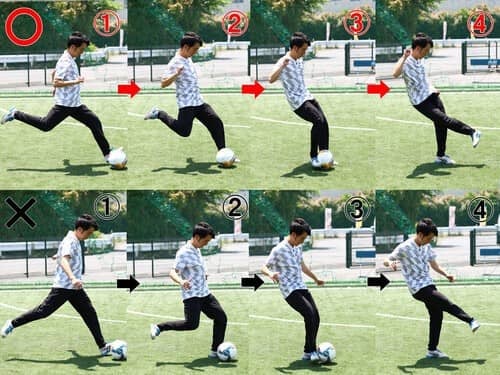 ヒザの曲げ伸ばしをうまく使うキック(上)と、うまく使えないキック(下)。インサイドの面を作るのが