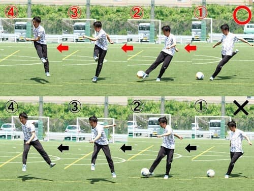 一方で、正しい蹴り方はボールよりも後ろに股関節の軸が残り、蹴り足が斜め上に振り上がるところでインパクトする蹴り方です。
