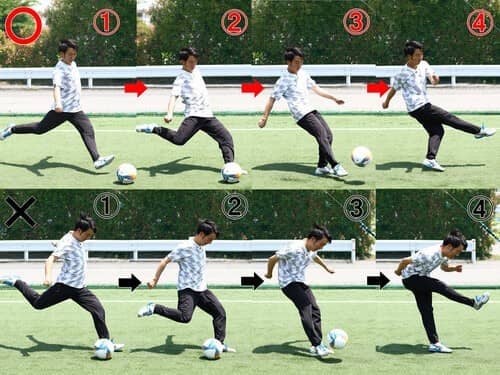 しかし、体がボールの真上まで来てしまうと、蹴り足の振りが平行に向かっているところから無理やり足ですくい上げるような窮屈な姿勢になり、うまく蹴ることができません。