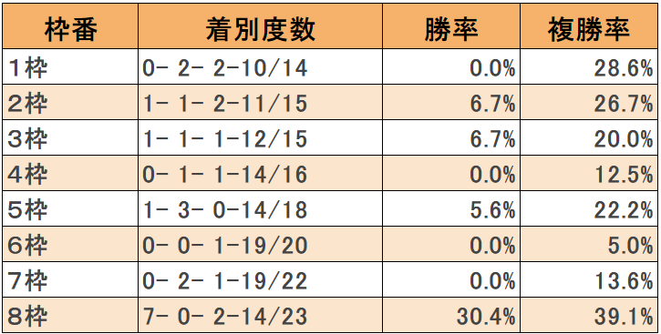 枠別では最多となる9回の馬券絡みが8枠で、4回の1枠、2枠、5枠が続く。一方で6枠は1回のみで最少となっている。