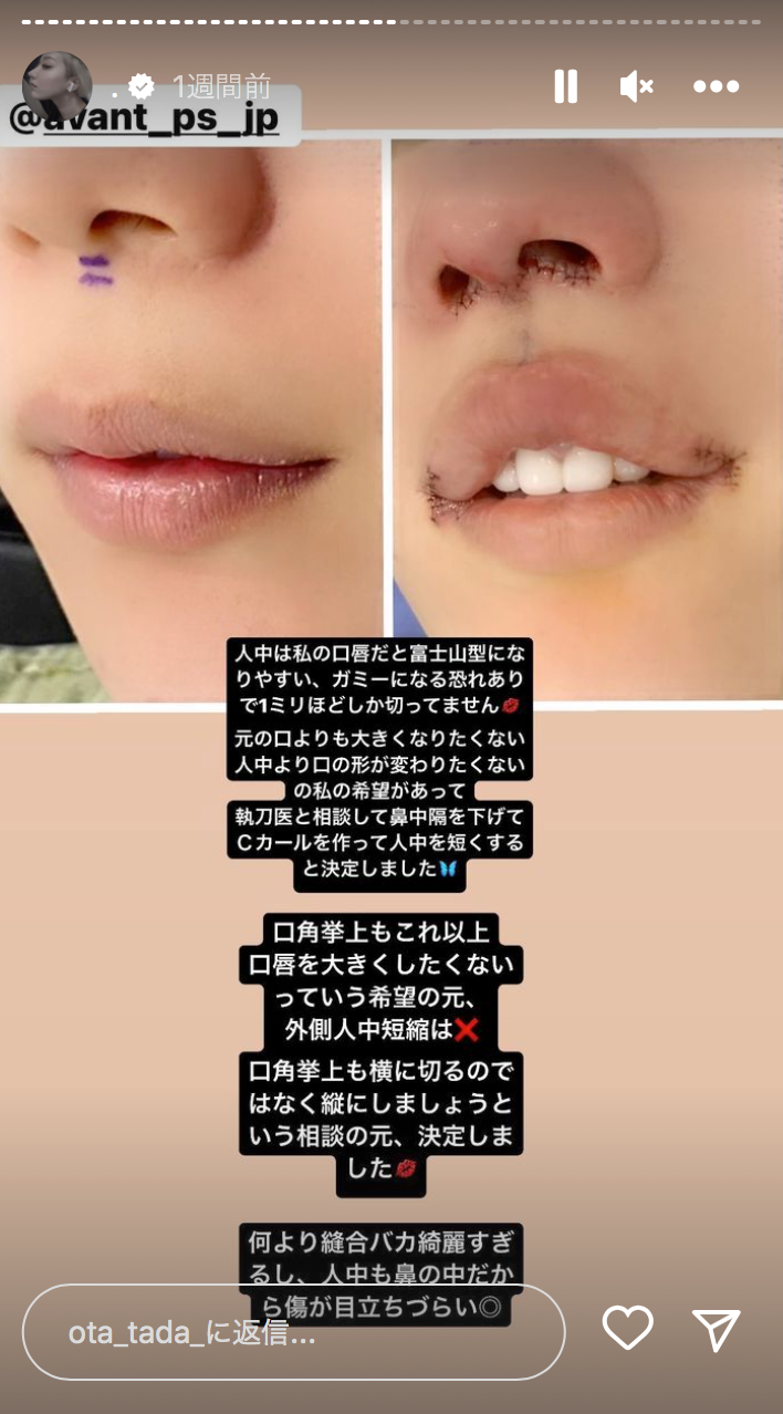 美容やダイエットの質問にも丁寧に回答しており、フォロワーからの信頼は厚い。韓国で行った鼻整形・再手術の際には、包帯だらけの痛々しい画像にフォロワーからは「凄い💦」「超リアル😵」など驚愕の声が上がっていたという。