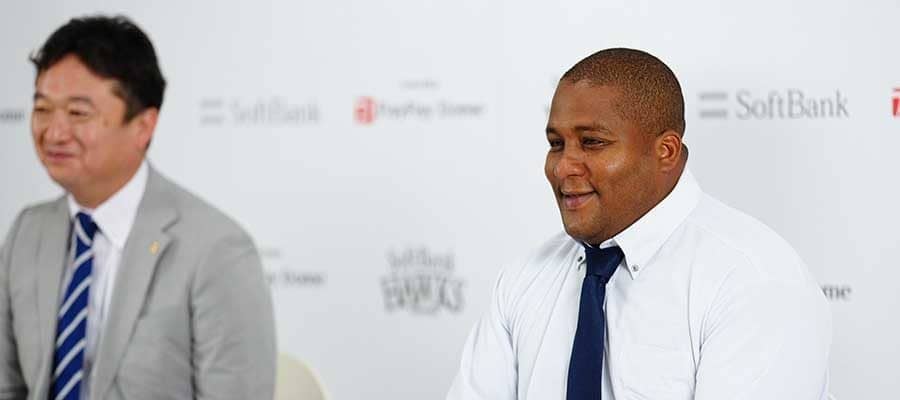 ソフトバンクは25日、PayPayドームでアルフレド・デスパイネ外野手の入団会見を行った。本人は「素直にすごくうれしく思います。チャンスをくれたホークスに感謝しています。早くグラウンドに立って、チームに貢献したい」と心境を語る。同席した三笠杉彦GMは、獲得に至った背景を説明した。