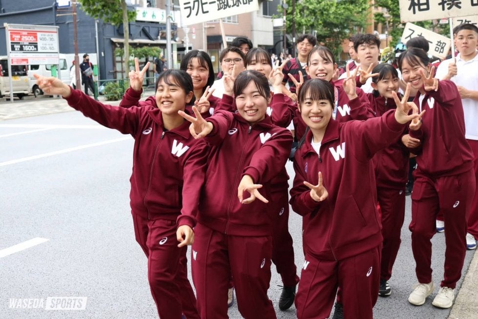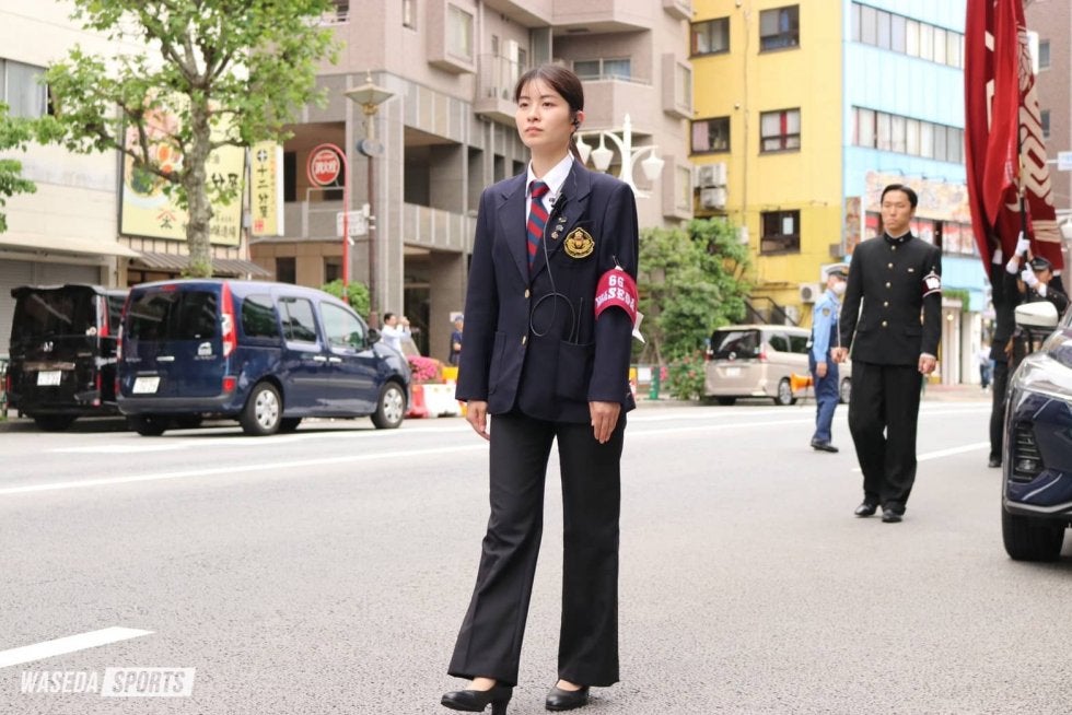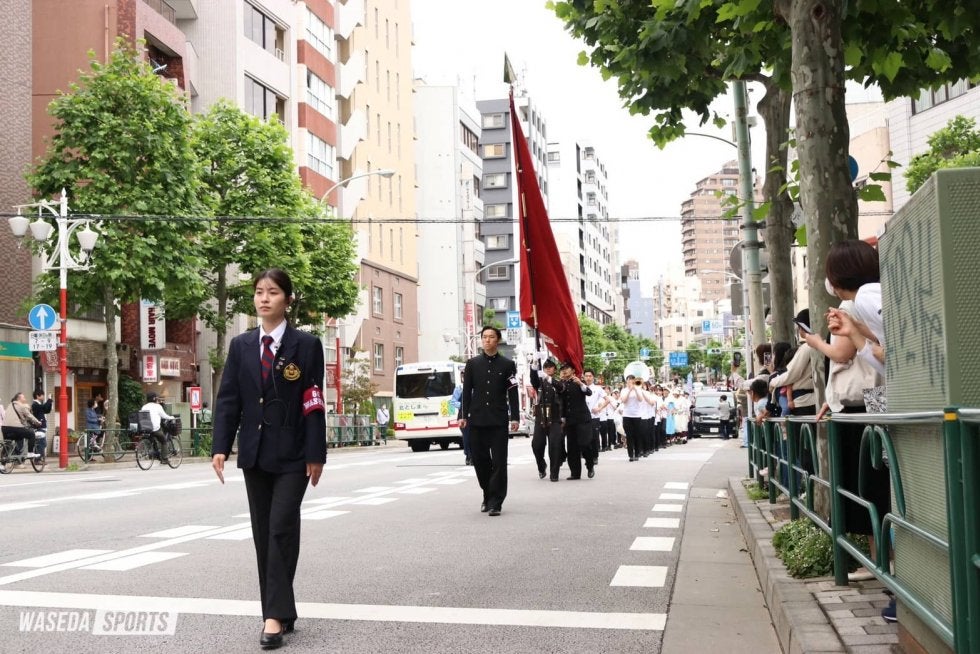 新人パレードは14時15分よりスタートした。先頭の体操部・芦垣舞体育各部実行委員長(教4=神奈川・横浜雙葉)に続き、新人部員は2グループに分かれて行進。芦垣体育各部実行委員長とともに、応援部代表委員、校旗、吹奏楽団もパレードを先導した。高田馬場駅前ゆう文ビルから早稲田通りを通過し、八幡坂、早大南門通り、大隈記念講堂を経て、大隈通り、グランド坂へ。吹奏楽団による応援曲メドレーの演奏が響きわたる中、沿道の人々も足を止めて手やエンジ色の小旗を振った。新人部員も笑顔で応え、早稲田の街一体と交流を深める新人パレードとなった。