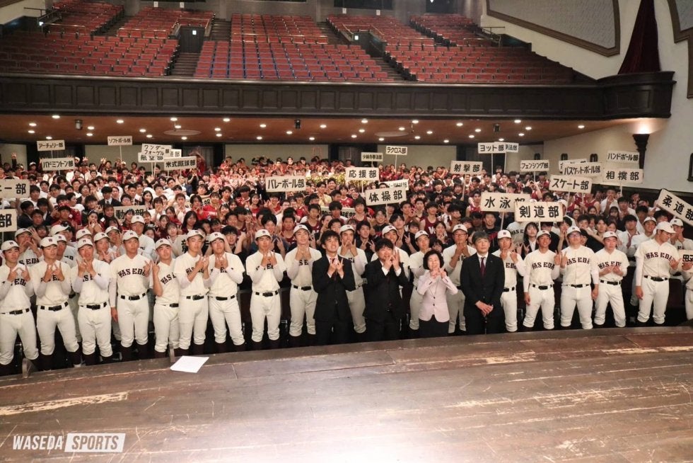 パレード終了後は大隈記念講堂に移動し、宣誓式を挙行。石井昌幸競技スポーツセンター所長を前に、体操部・田村優(スポ1=東京・松陰大松陰)と剣道部・森島百咲(スポ1=香川・高松商)が代表して宣誓を行い、今後4年間の飛躍を誓った。宣誓式終了後は、親睦会を開催。所属部活の壁を越え、新人部員同士で親交を深める機会となった。