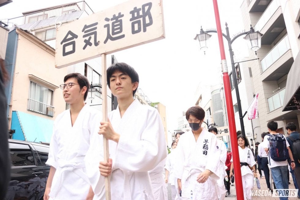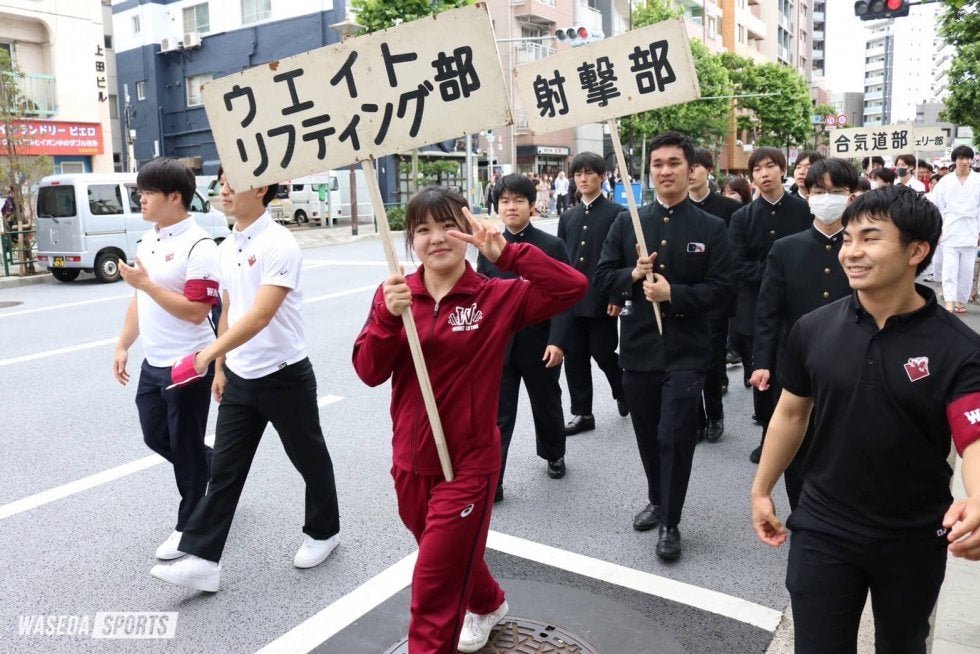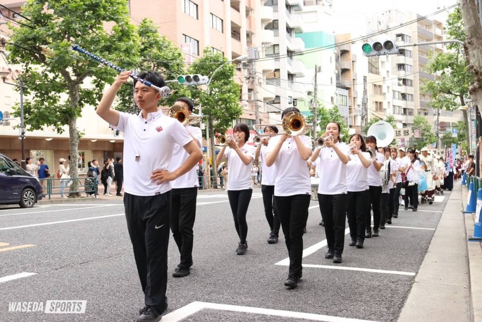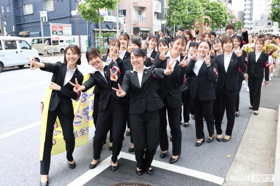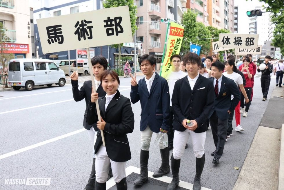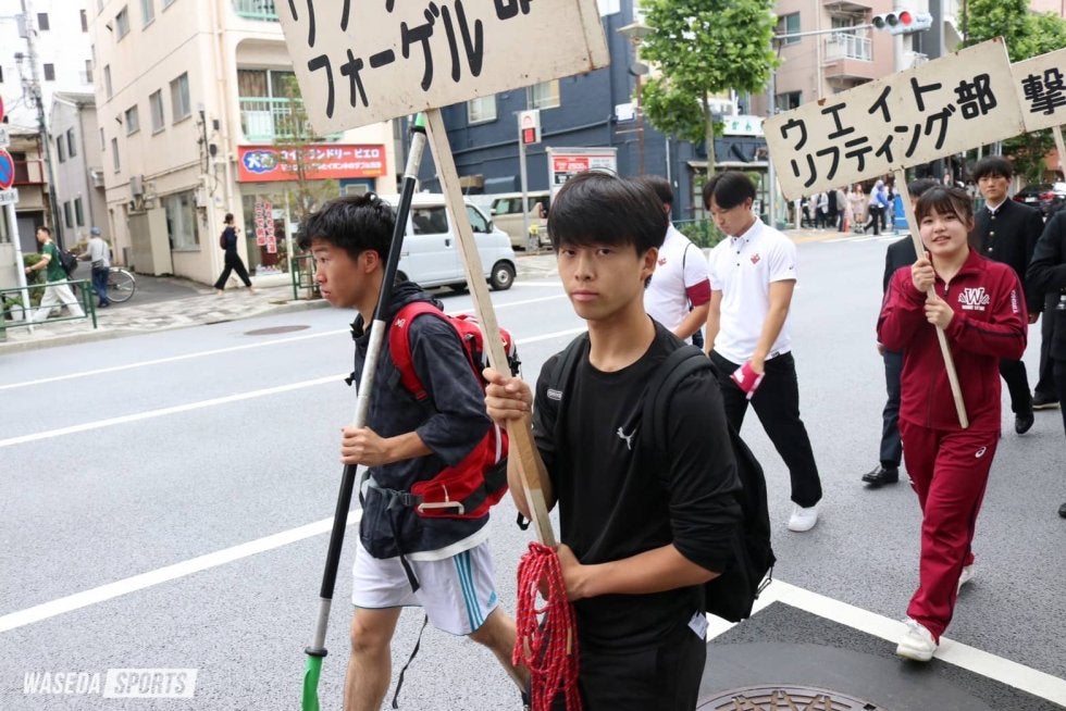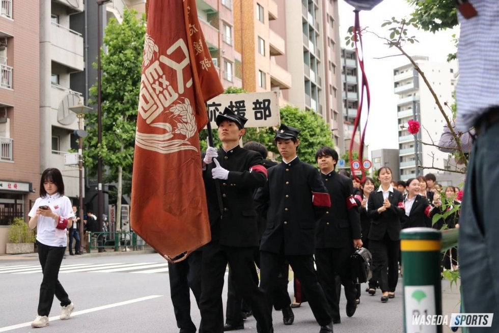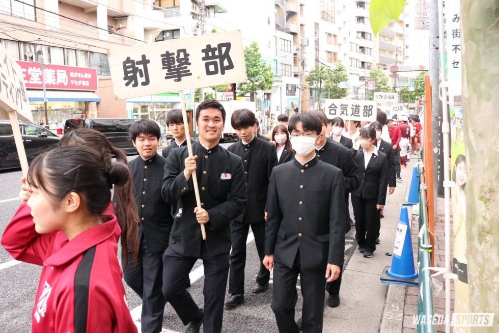 入部式が挙行された5月20日の午後、高田馬場駅近辺から早稲田キャンパスまで新入部員パレード(新人パレード)が実施された…