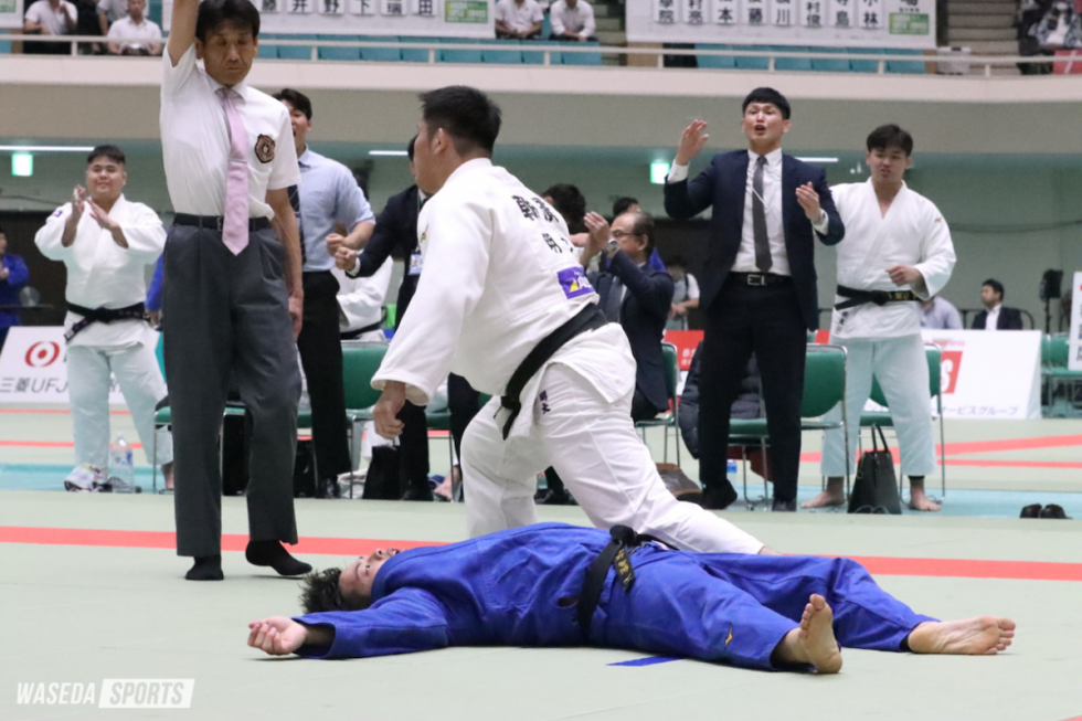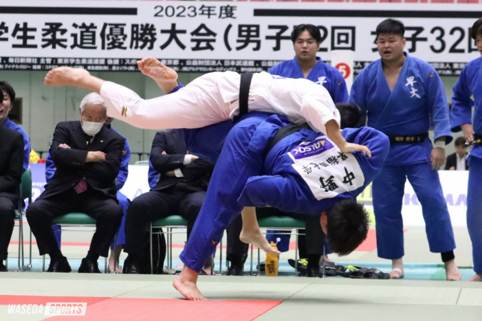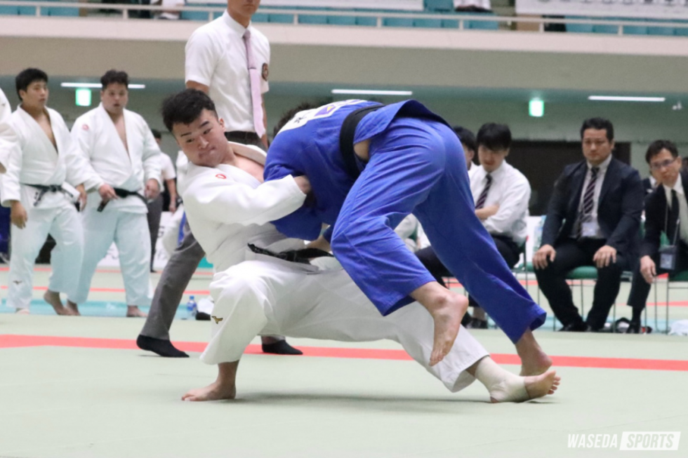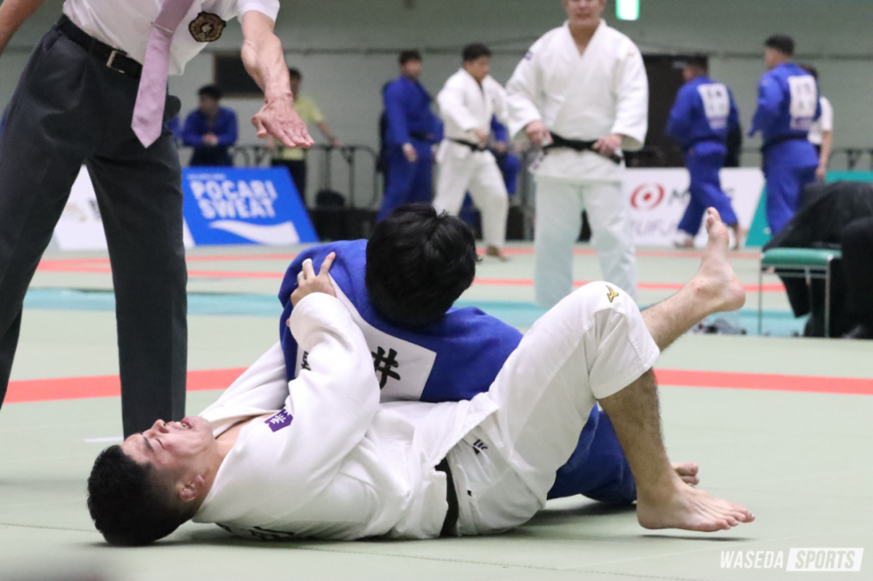 目標のベスト4入りへ、明大との一戦に臨んだ早大。しかし、先鋒・飯田が序盤に内股で技ありを取られて優勢勝ちを許すと、続く次鋒・安藤は自身が掛けた大外刈に対して大外返を決められ、一本負けを喫してしまう。なんとかポイントを取りたい中、五将・笠井が中盤に払巻込で技ありを獲得。その後、相手が寝技のために自身に覆い被さった隙を突いて体を返し、後袈裟固で技ありを決めて一本勝ちを収めた。このまま勢いに乗りたい早大だったが、中堅を務めたエース・中野が終了まで残りわずかのところで小外刈を決められ、痛い一本負け。早大は続く三将・道下が引き分けに終わり、勝利には後続二人の一本勝ちが絶対条件という苦しい展開となる。もう後がない中で続く副将・中島が悔しくも敗れ、2-4で準々決勝敗退となった。