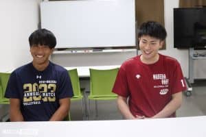 第1回は、チームを率いる水町泰杜主将(スポ4=熊本・鎮西)と島田航希主将(慶大)の2人。今まであまり面識がなかったとのことだが、ビーチバレーの話題などをきっかけにすぐに打ち解け、和やかな雰囲気で対談が行われた。理想のキャプテン像や春リーグの振り返り、最後の早慶戦に向けて意気込みなどを伺った。