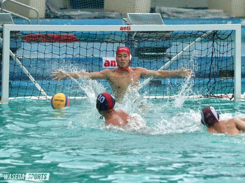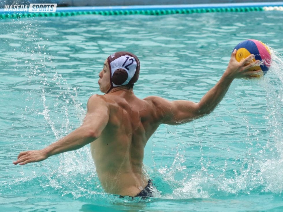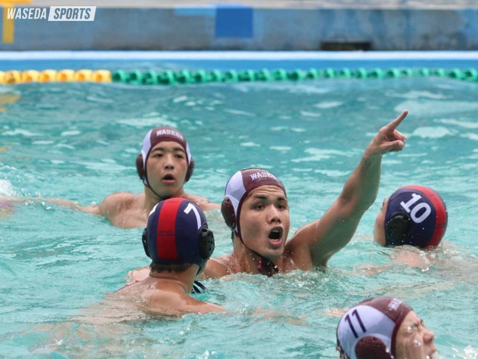 センターボールを取るも、先制したのは慶大。だが、中村大智(スポ3=埼玉・秀明英光)がすぐさまスコアを返すと、続いてセットプレーから都田楓我主将(スポ4=鹿児島南)の的確な指示が飛び、加納恒心(スポ1=東京・明大中野)もゴール。さらに3分には、相手の攻撃ターン中に永野冬惺(スポ1=東京・明大中野)がインターセプトし、ボールは中村へ。中央から落ち着いてシュートモーションを取り、3連続得点を決めた。しかしその後は相手にペナルティスローや連続得点を献上。早大も追い越されまいと永野、古谷典也(スポ2=東京・明大中野)がゴールを揺らし、5-5の同点で第1Pを終えた。第2Pも終始接戦ベース。2分、カウンターから前線に上がってきた古谷が、左サイド近距離から自力でネットを揺らす。その直後のカウンターアタックでも、ゴール前で相手を左右に惑わし、前に詰めていた曵地孝太郎(スポ3=埼玉・秀明英光)が華麗にシュート。さらに次のカウンターでも、相手の退水(※)からの数的優位を生かし、中村が素早くボールを刺した。こうして3点をリードしたが、「ほころびが出た」(曳地)。慶大をゴール前で自由にさせてしまう時間が増え、このPでも2度の連続得点を奪われる。中村、そして佐野裕一朗(人3=長崎西)の今季初得点でなんとか粘りを見せ、このPでもスコアは同じまま。勝負の行方は後半に託された。