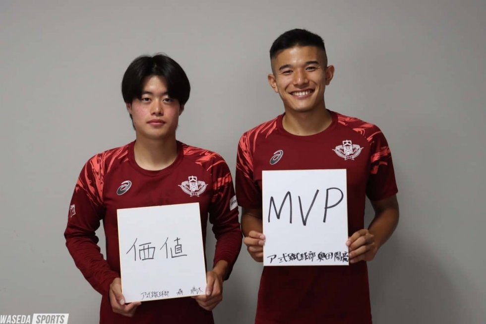 奥田 自分は前も言ったかもしれないですが、高3の時のゴリ君(加藤拓巳=令4スポ卒・清水エスパルス)のゴールを見て憧れて、実際ここ(ア式)にお話いただいた時に早慶戦でMVPをとることを目標として、ア式に決めたので。目標というか、憧れの舞台でもありますし、ここで夢を叶えたいという場所です。