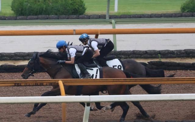 函館記念に向け追い切りをおこなったイクスプロージョン(写真手前、撮影:井内利彰)