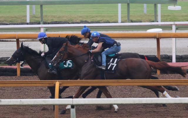 ジャパンダートダービーに向け追い切りをおこなったユティタム(写真手前、撮影:井内利彰)