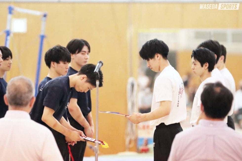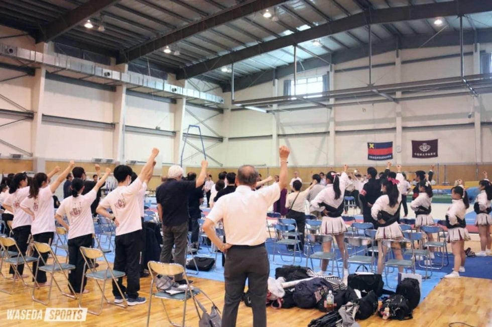 男子団体の後には、慶大選手によるトランポリンエキシビション、女子選手による跳馬、ゆかでのエキシビションが行われた。跳馬には1年生の犬養愛瑠(国教1=香港国際学校)、篠原理紗(スポ1=広島・ノートルダム清心)の2人が登場。着地に乱れはあったが、1年生らしいフレッシュな演技を披露した。また、ゆかに挑んだ田村七紗(先理3=東京・錦城)は、指先まで意識された演技で観客の心をつかんだ。最後は早大応援部、慶大応援指導部による活気あふれるエキシビションで終幕となった。