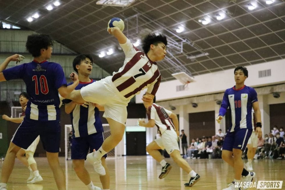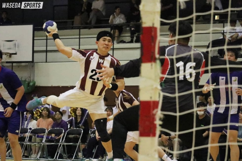 関学大のスローオフで試合は始まった。まずは関東学生春季リーグ(春季リーグ)得点王の白築琢磨(文構3=東京・早実)が接触されながらもゴールをもぎ取り、先制点を挙げた。一方、関学大は前半3分、関西学生春季リーグ得点王の佐橋陵汰(3年)がカットインでチーム初得点を挙げる。早大はリードを奪うも、相手G K五十嵐賢人(4年)が早大に流れを渡さない。前半5分に小柴創(スポ1=千葉・昭和学院)のポストシュートを止めると、後半9分から11分の間に、3つのシュートを止めて速攻を防いだ。嫌な雰囲気が早大に漂い始めると、前半14分ポストへのパスが通らず、速攻で6―6と同点に追いつかれる。続けて前半15分にスカイプレーを試みるも、ラインクロスで相手ボールになり、逆転を許した。後半16分には鍋島弘樹(スポ1=福井・北陸)がクロスアタックディフェンスの裏を通そうとパスをするが、カットされ速攻を決められる。さらに相手の速攻時に白築が横から接触してしまい退場となると、早大はすかさずタイムアウトを要求。タイムアウト明けに早大は6人で2分間試合を行わなければならないはずだったが、7人出場しているという不正入場を犯し、さらにもう一人退場する事態に。関学大は数的有利な状況を生かしてエンプティゴールを含む4連続得点に成功。流れは完全に関学大に渡り、前半を9―15で折り返した。