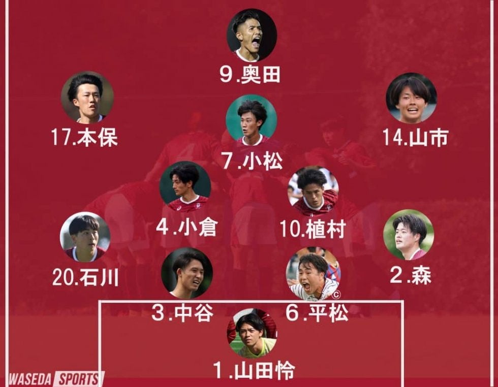 後半も互いに譲らない展開が続く。そんな中、早大はFW鈴木大翔(スポ1=ガンバ大阪ユース)やMF平野右京(人4=兵庫・滝川)といった攻撃のカードを切り、流れを手繰り寄せる。61分にはゴール前まで押し込むと、最後はMF山市秀翔(スポ1=桐光学園)が狙いすましたシュート。しかし、これはクロスバーに阻まれる。74分にはMF植村洋斗副将(スポ4=神奈川・日大藤沢)が強烈なシュートを放つもこれは枠外へ。それでも迎えた76分、ついに試合が動く。左サイドでボールを受けた森が絶妙なクロスを送ると、ファーサイドで待っていた平野がヘディングで合わせ先制に成功する。この1点を守り切り、早大が2連覇を飾った!