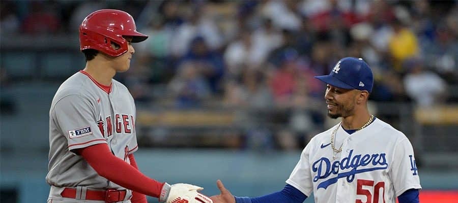 二塁ベース上で言葉を交わすエンゼルス・大谷翔平(左)とドジャースのムーキー・ベッツ【写真:ロイター】