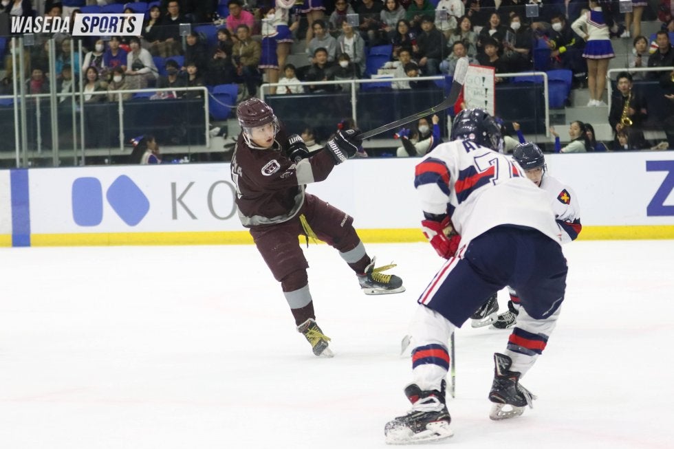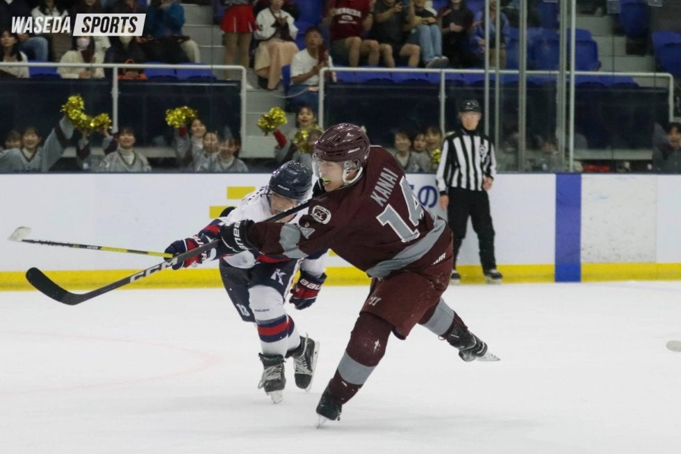慶大のホームKOSÉ新横浜スケートセンターで第68回春季早慶定期戦(春季早慶戦)が行われた。両大学創部100周年という記念すべき年に多くの観客と応援部の応援の中、良きライバルと伝統の一戦を交えた。正午から大OB戦、OB戦、高校戦が行われ、待ちに待った現役戦。第1ピリオド(P)、安定したプレーで2−0とリードする。その後、第2Pでは慶大ペースのまま試合が進み1点を許してしまう。しかし第2P終了間際、立て続けに得点を決め4−1で第3Pへ。早大が得点を重ね、リードをさらに広げる。終盤、両者の早慶戦への熱い思いが感じられる白熱した試合展開となり、6−1で春季早慶戦を勝利で飾った。