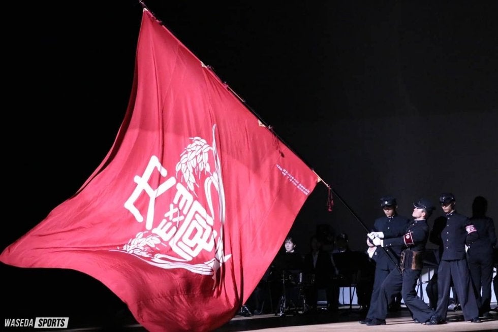 オープニングが終わると、各大学の校旗紹介。そして、校歌、応援歌、応援曲、拍手が披露された。明治大学応援団、東京大学運動会応援部に続き3番目のステージとなった早稲田大学応援部。初めに校旗の紹介が行われた。『早稲田の栄光』に合わせ、間垣により堂々と大校旗が掲げられる。『昇り竜』と呼ばれる左右に大きく振りながらの迫力満点の校旗掲揚に観客も注目を集めた。