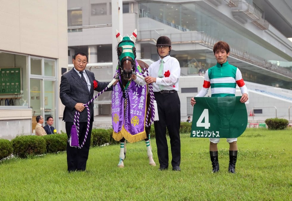 9日、盛岡競馬場で行われた11R・オパールカップ(M2・3歳・芝1700m)は、本田正重騎乗の1番人気、ラビュリントス(牝3・川崎・内田勝義)が快勝した。4馬身差の2着に3番人気のナイトオブバンド(牡3・船橋・米谷康秀)、3着にプルタオルネ(牡3・北海道・小国博行)が入った。勝ちタイムは1:45.6(重)。