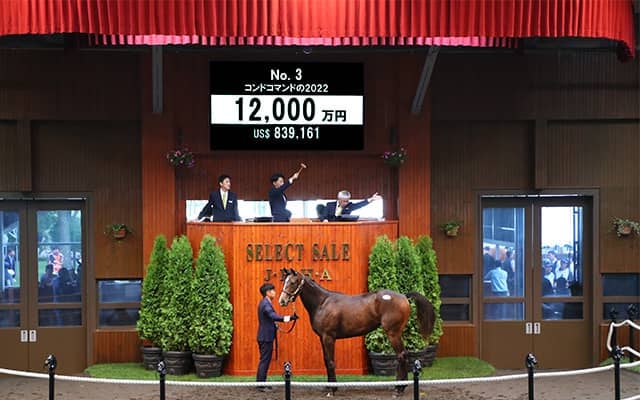 10日、苫小牧・ノーザンホースパークで行われている日本最大のサラブレッド市場「セレクトセール2023」1歳馬セールにて、上場番号3番・コンドコマンドの2022(牝)が1億2000万円で落札された。