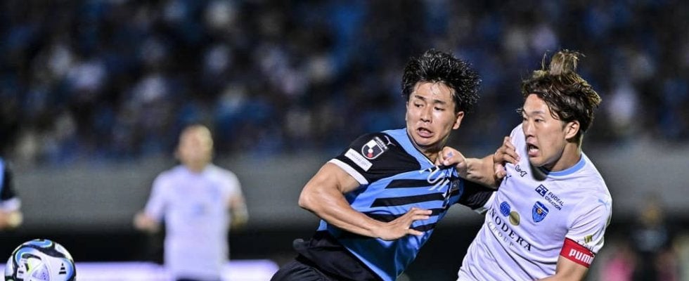 川崎フロンターレと横浜FCの試合に訪れた。写真は山田新と岩武克弥 撮影:中地拓也