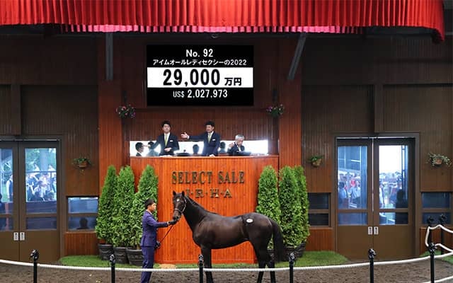 10日、苫小牧・ノーザンホースパークで行われている日本最大のサラブレッド市場「セレクトセール2023」1歳馬セールにて、上場番号92番・アイムオールレディセクシーの2022(牡)が2億9000万円で落札された。