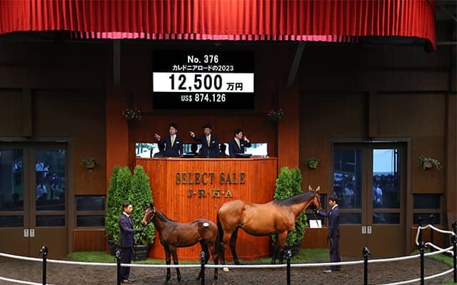 11日、苫小牧・ノーザンホースパークで行われている日本最大のサラブレッド市場「セレクトセール2023」当歳馬セールにて、上場番号376番・カレドニアロードの2023(牝)が1億2500万円で落札された。