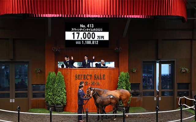 11日、苫小牧・ノーザンホースパークで行われている日本最大のサラブレッド市場「セレクトセール2023」当歳馬セールにて、上場番号413番・スウィッチインタイムの2023(牝)が1億7000万円で落札された。