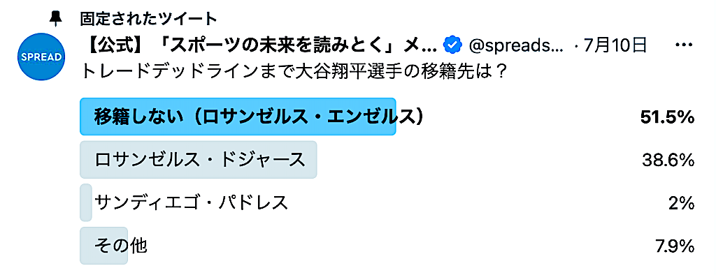 関係者によるとエンゼルスは大谷をトレードしない方針ではあるが、SPREAD編集部は8月以降の大谷の所属先をSNSを利用し読者にアンケートを募った。機能の限定により選択肢はわずか4つばかりではあるが、それでも意見が真っ二つに割れた。