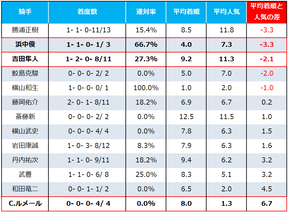 特定の騎手が活躍し続けるレースではなく、さまざまな騎手に活躍のチャンスがあることがデータからうかがえますね。