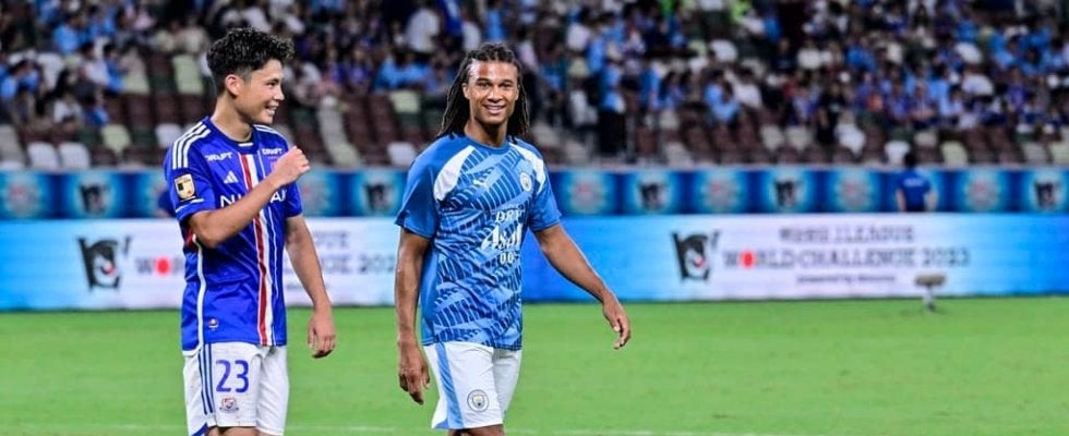 横浜F・マリノスの宮市亮と談笑するマンチェスター・シティのナタン・アケ 撮影:中地拓也