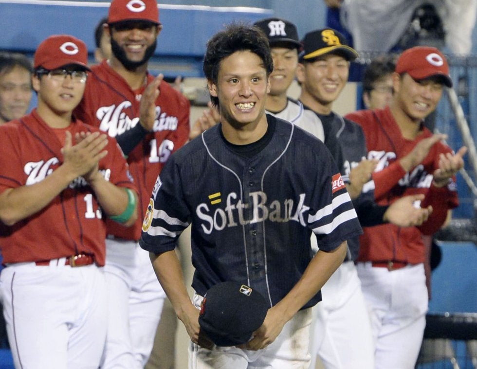 「カラー」 フレッシュオールスター戦 MVPに選ばれ拍手で表彰に送り出される、ウ選抜でソフトバンクの曽根(中央)=静岡【写真提供:共同通信社】