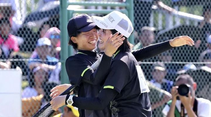 前田の緩急自在のストロークと、1メートル69の長身を生かして前に出る中谷の攻撃的なプレーがかみ合った。決勝でも「最後は攻めようと思っていた」と中谷。マッチポイントでは前田のカットサーブで相手の返球が浮いたところを見逃さず、強烈なボレーで試合を決めた。