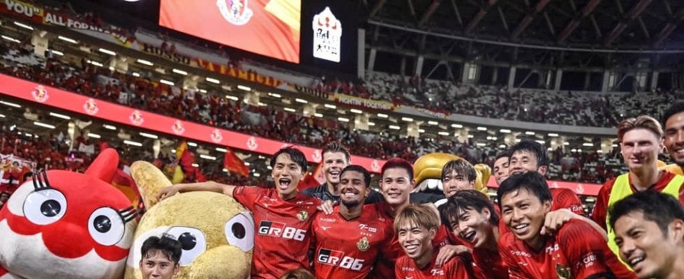 アルビレックス新潟戦で勝利して喜ぶ名古屋グランパスの選手 撮影:中地拓也