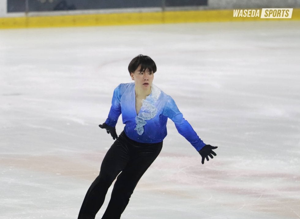出場を予定していた新入生の坂﨑愛介(基理1=東京・早大学院)の棄権により、早大フィギュア部門の選手は大会2日目の5、6級男子部門から登場。トップバッターで登場したのは、今年度フィギュア部門の主将を務める岡島右京(商4=東京・早大学院)だ。久々の試合だったが、直前の6分間練習からエレメンツをひとつひとつ確認し、本番に臨んだ。ゆったりとした曲が流れ始めると、身体を大きく使った伸びやかな滑りで、ジャンプの軌道へと入っていく。最初に挑んだ2回転アクセルは、着氷時に重心が後ろに傾いてしまうようなかたちで降りてきてしまったが、転倒せず次の3回転トーループへと向かう。その3回転トーループは両足で着氷し乱れたが、「3回転を回るというところを意識してできたというのは大きい」と、久々に試合で投入したジャンプから収穫を得た。直後の2回転アクセルは惜しくも転倒し、その後のジャンプやスピンでややミスが目立ってしまった。しかし、会場全体に伝わるようなダイナミックな動きや構成を上げたプログラムに果敢に挑む姿で、4年生らしさ、主将らしさが感じられる演技を披露した。