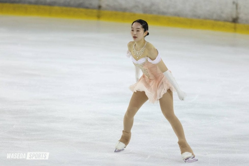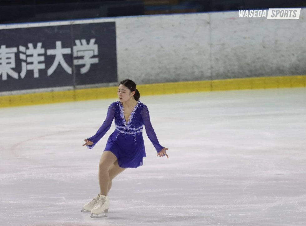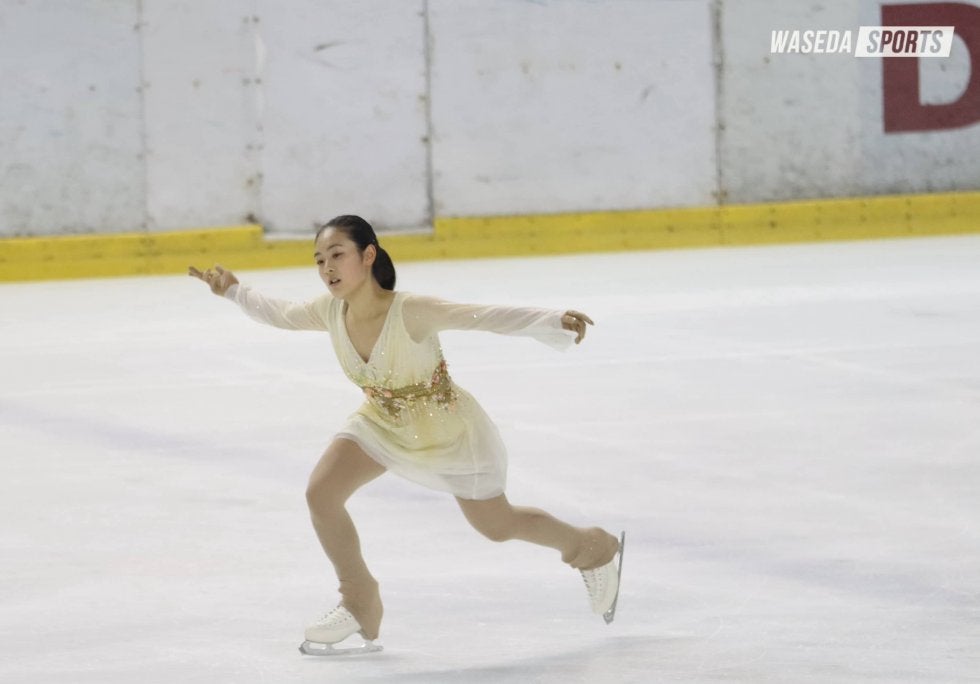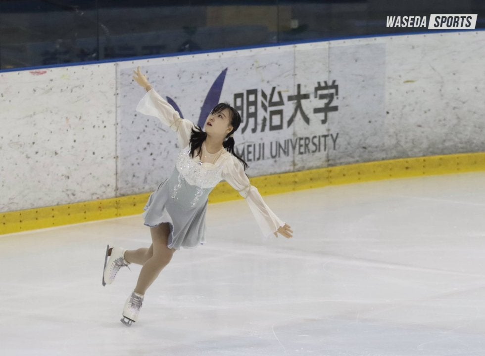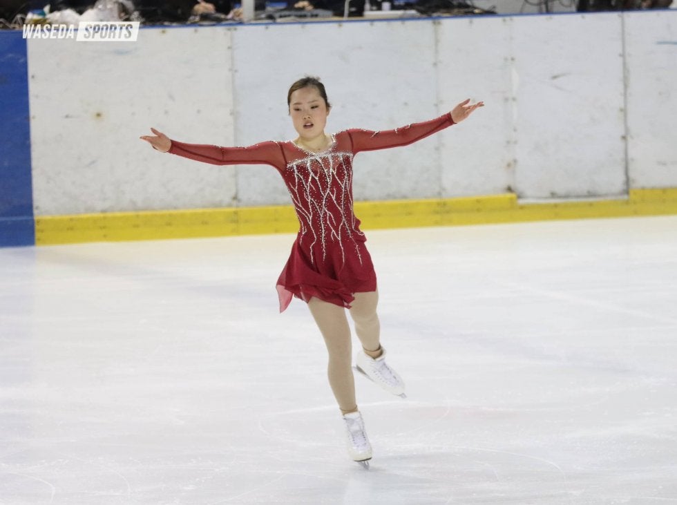 ラストイヤーを迎えた馬場はシーズン初戦。新しいプログラムに合わせた赤の衣装を纏い、リンクのショートサイド端に近い位置でスタートポジションにつく。曲が始まると、リンク中央に向かって直進する振り付けから演技を始め、ゆったりとした曲調に合わせたしなやかな動きでエレメンツに入っていく。最初のジャンプは回り切れずに降りてきてしまうようなかたちで転倒。しかし、その失敗を引きずることはなく、続くコンビネーションジャンプを落ち着いて決める。プログラム終盤の2回転アクセルは耐えるような着氷になったが、大きく流れを断ち切ることなくまとめた。ステップシークエンスでは、切ない曲調に合わせて上半身を柔らかく使った表現で、複雑なエッジワークも難しく感じさせずに見せていく。最後は、歌を残して消えるような音楽に合わせてスピンをほどきフィニッシュ。細かいミスはあり、本人も「練習の50パーセントくらい(の力)しか出ていない」と振り返るものの、点数は40点台に乗せ、地力の向上を感じさせた。秋のブロック大会では、1、2年次は東京選手権止まりだったが、3年次は東日本選手権に進出し、年々進化を遂げている馬場。「東京ブロック(東京選手権)までに試合に慣れるために出場した」今大会と、夏に出場予定の今後の大会で、良い感覚をつかんで秋以降の大会に挑んでもらいたい。ラストシーズン、悔いの無い結果を残せるよう願うばかりだ。
